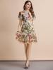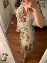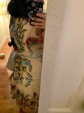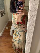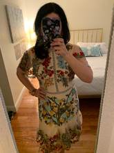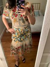 Pretty dress, the fabric underneath is very thin so I think it will need a slip. The top is too big on me, I ordered the XL. In the US I usually wear a size 4-6. Bra size 34 B. The top on the XL is too big for this size but this was the right size for my waist which was is 30 inches. This store’s product matches the dress being sold. There is a seller who has it cheaper but in the review photos you can see the pattern doesn’t match.