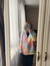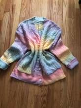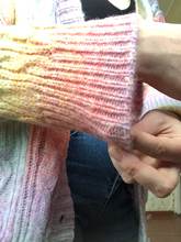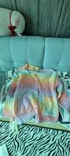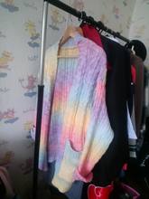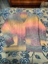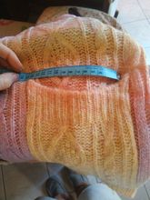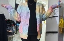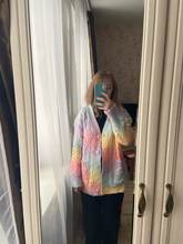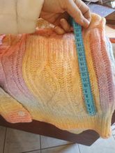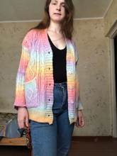 Cardigan, bright, weightless, fluffy. In my 44-46, the height of 155 cm oversize, but the yarn of synthetics, similar to acrylic, has a strong chemical smell. I'll have to wash it right away. Delivery fast, two weeks.
