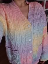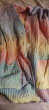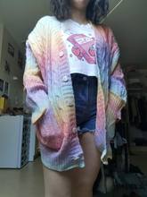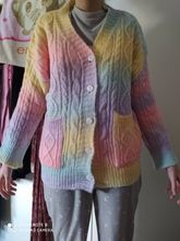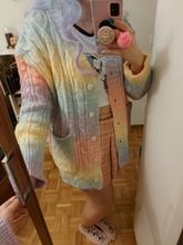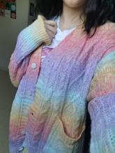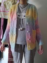 Very soft cardigan, small buttons, took the largest size, my height 160, I wanted to look as oversize, but in the photos the store still has it. Before Moscow drove a little less than a month, there is a small factory smell, I hope after washing does not sit down