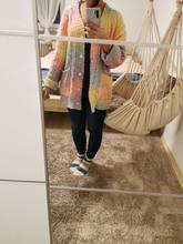 Very nice! It has the same colors as the one in the photos, although it's not that oversized. I ordered the bigger size, I measure 1,58 and I'm a little lower than the hip, the sleeves are the right length. The buttons a little loose, but it's easy to reinforce them. The material is very soft and warm. It has a slight chemical smell but after a while it leaves. I generally like it very much, fit with my aesthetics also arrived within the deadline, very quickly considering the current conditions. I recommend it!