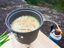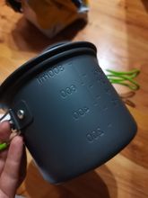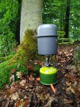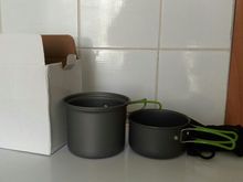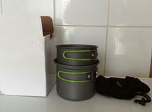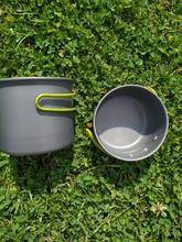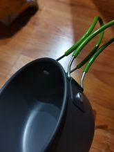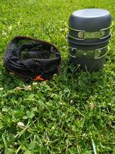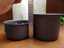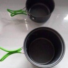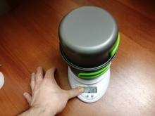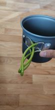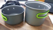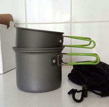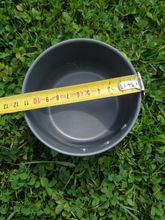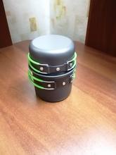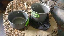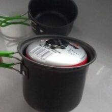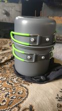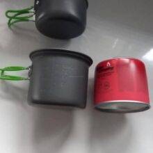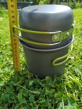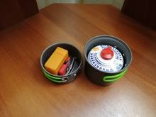 At first consideration, the bowler is quite good quality. There is one small scratch of the coating on the side, but not critical. In the pot clearly stands up and does not eat on the bottom of a standard balloon with gas. The lid easily fits a small burner, a lighter, a folding spoon, tea and coffee bags, a little sugar and other trivia. It turns out a very convenient and compact set. The lid is convenient to use in the form of a mug. In the pot you can boil water and cook simple dishes. In general, quite a good bowler.
