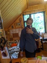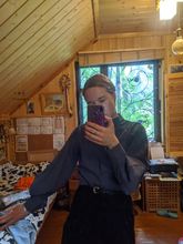 Блузка интересная, плотная ткань. Не знаю, что с ней будет после строк. Но первоначально выглядит очень хорошо. На ог 86,от 66,об96 размер м как раз, не давит и не висит. Только горловина немного широка, не облегает.
